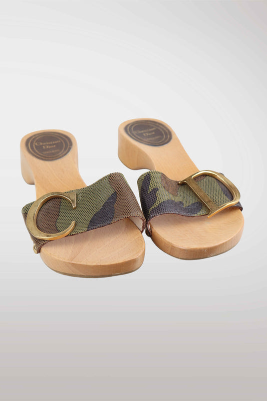 Vintage Christian Dior Buckle Camouflage Wooden Mules | EU35.5